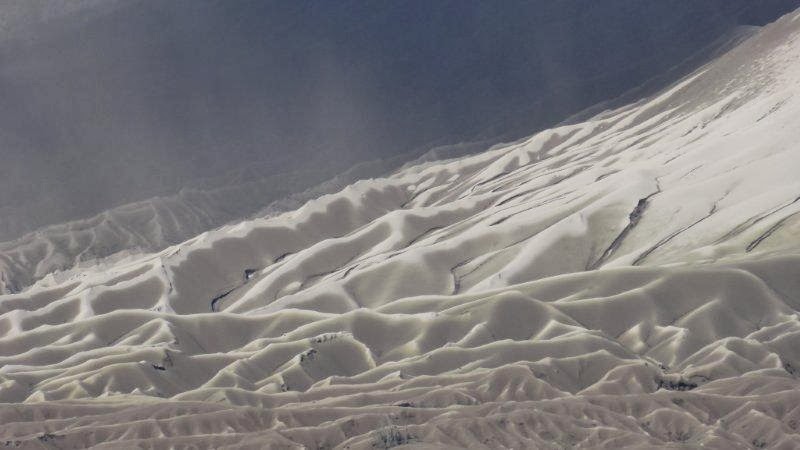 噴出來的火山灰含有各種不同的礦物. 這落在火山口邊的白色粉末應該是比重很高的一種礦物, 從遠方看去卻像是精心舖蓋在火山山坡上的一塊絲絨?