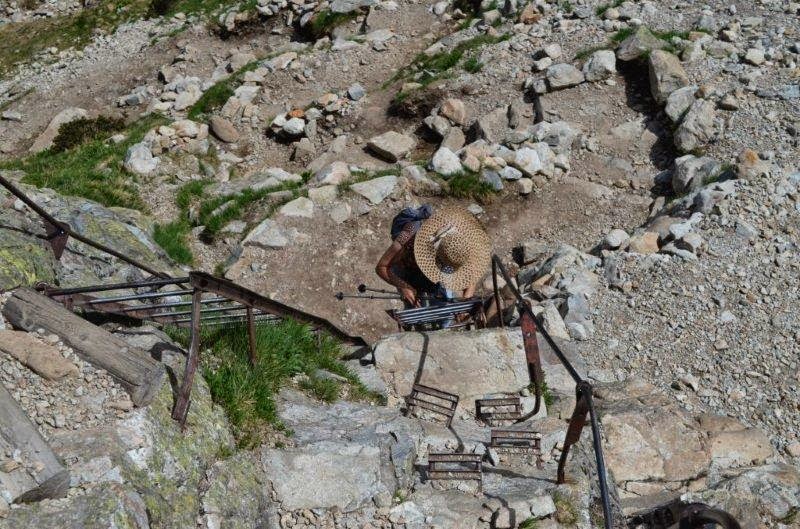 這裡過於陡峭.我們順著山道不時的轉向,下木條階,走鐵網階,上崁在岩石上的鐵板...花樣還真不少.